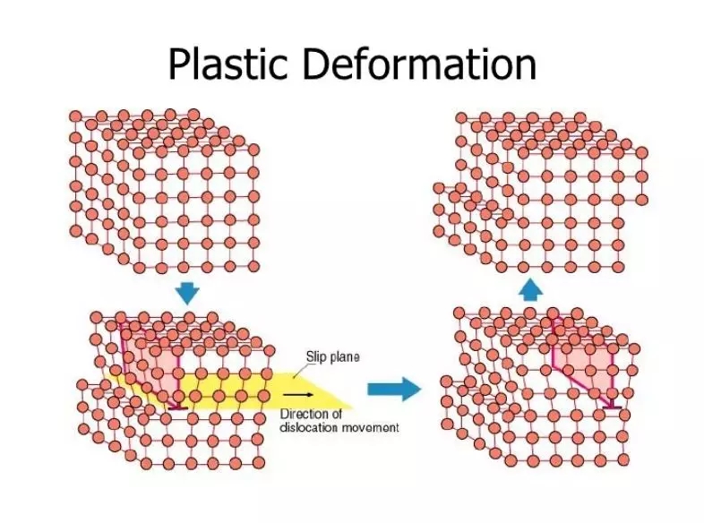 在這一點上,與鄰接的初始原子間的鍵合開始破裂并用一組新的原子進行改造。當這種情況發(fā)生時,應力被卸除后材料將不再恢復到原來的狀態(tài),即變形是永久的和不可恢復的。這時材料進入塑性變形區(qū)(圖1)。