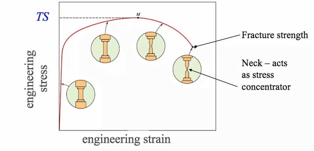 繼續(xù)增加應力,曲線達到較大值。較大值對應抗拉強度,這是曲線的較大應力值,由圖中的M表示。斷裂點是材料較終斷裂的點,由圖中的F表示。